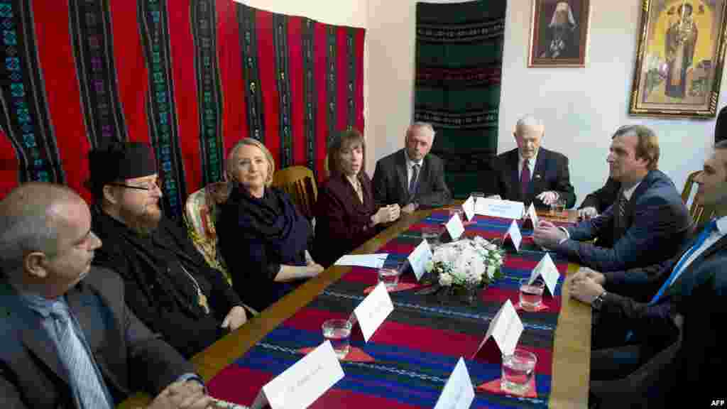 Ati Sava Janjiq me sekretaren e Shtetit, Hillary Clinton, në një takim me të kthyerit serbë në Kishën ortodokse të Shën Nikollës në Prishtinë...