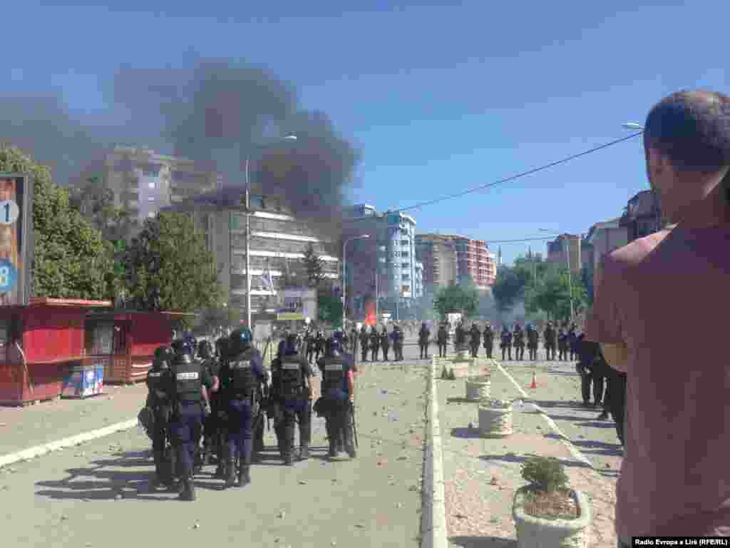 Policia po përdor gazin lotsjellës për të penguar protestuesit që t'i afrohen urës mbi lumin Ibër. Qytetarët, vazhdimisht po gjuajnë me gurë në përpjekje që të çajnë kordonin e policisë. Të paktën dy veturave, një e Policisë së Kosovës dhe një e Policisë së EULEX-it, u është vënë flaka.