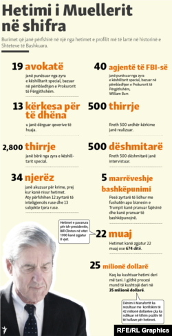 Hetimet e Muellerit, që kanë zgjatur 22 muaj, kanë rezultuar me ngritjen e padive për 34 njerëz, përfshirë gjashtë ish-ndihmës të Trumpit dhe disa rusë, si dhe tri kompani.