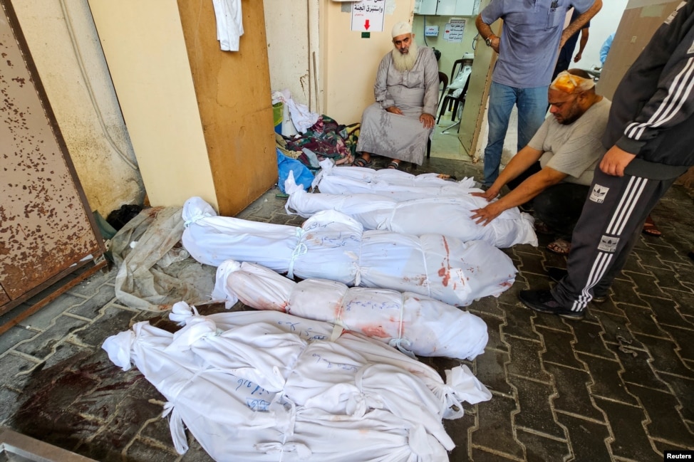 Disa njerëzit qëndrojnë pranë trupave të palestinezëve që u vranë në sulmet izraelite, ndërsa konflikti mes Izraelit dhe grupit islamik palestinez, Hamas, vazhdon, në Rripin verior të Gazës, 23 tetor 2023.