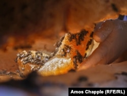 Tamaz Putkaradze nxjerr mjaltin nga kosherja e bërë me dru dhe tela rreth 20 vjet më parë. Këto koshere, ai i ka vendosur në të çarat e një shkëmbi.