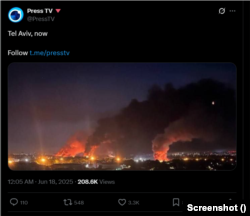 Një ditë më vonë, PressTV publikoi një tjetër foto në llogarinë në X, duke treguar tym që dilte nga shpërthime të shumta mbi horizontin e një qyteti, me përshkrimin “Tel Aviv, tani”.