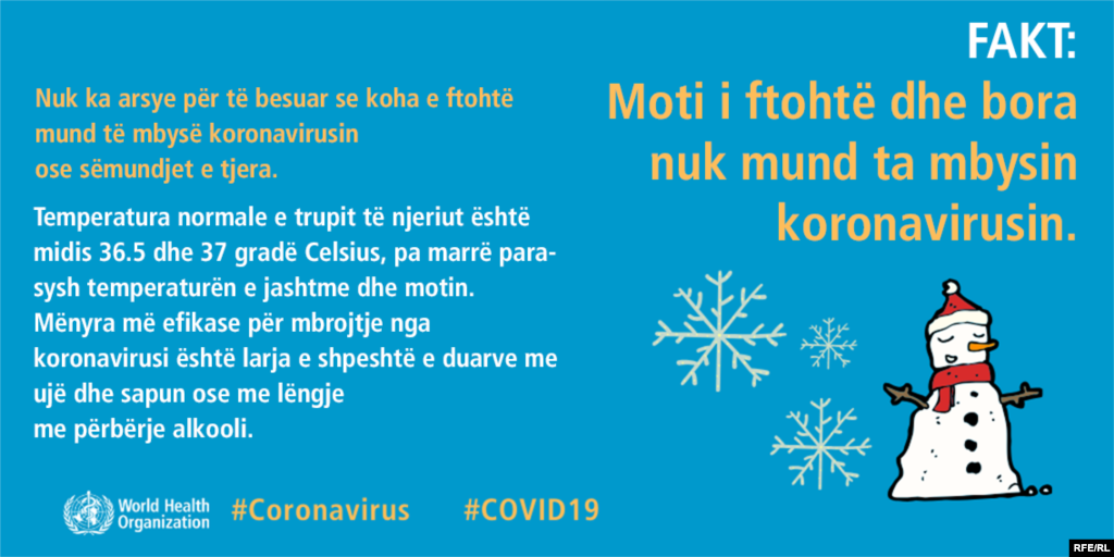 Për sa kohë mbijeton koronavirusi në sipërfaqe, a është rezistent ndaj motit të nxehtë apo të ftohtë, a janë të rinjtë më të mbrojtur dhe të moshuarit më të kërcënuar? Këto janë disa nga pyetjet në të cilat Organizata Botërore e Shëndetësisë i përgjigjet publikut përmes infografikave.