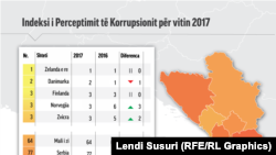 Organizata ndërkombëtare Transparency International në Indeksin e Perceptimit të Korrupsionit për vitin 2017, radhiti Kosovën në vendin e 85-ta, me 39 pikë, që do të thotë se ka bërë përparim të lehtë në luftën kundër korrupsionit, krahasuar me vitin paraprak kur ka qenë në vendin e 95-të me 36 pikë.