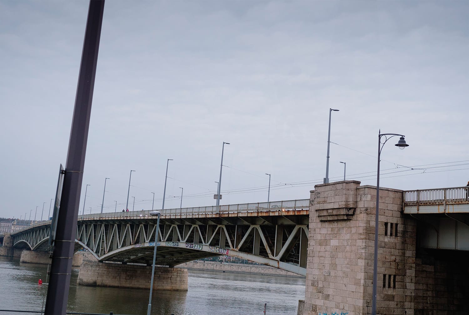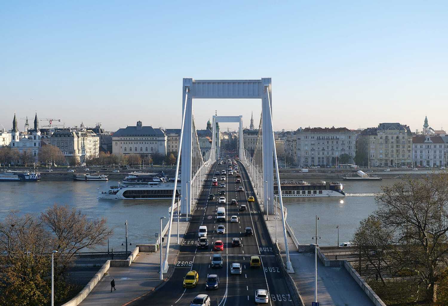 Ura Elizabeth e fotografuar në vitin 1943. Struktura u hodh në erë nga forcat gjermane teksa po tërhiqeshin në janar të vitit 1945 pas rrethimit të Budapestit. Mbetjet e përdredhura të urës qëndruan si një kujtesë e luftës për gati dy dekada para se të përfundohej një urë zëvendësuese utilitare më 1964. | Foto nga arkivi: Fortepan/ETH Zurich/Agnes Hirschi