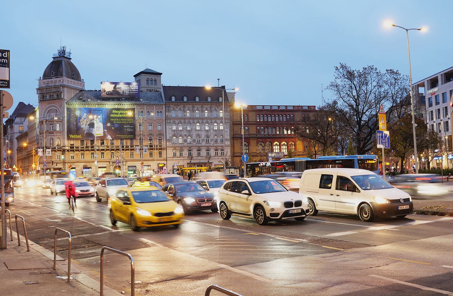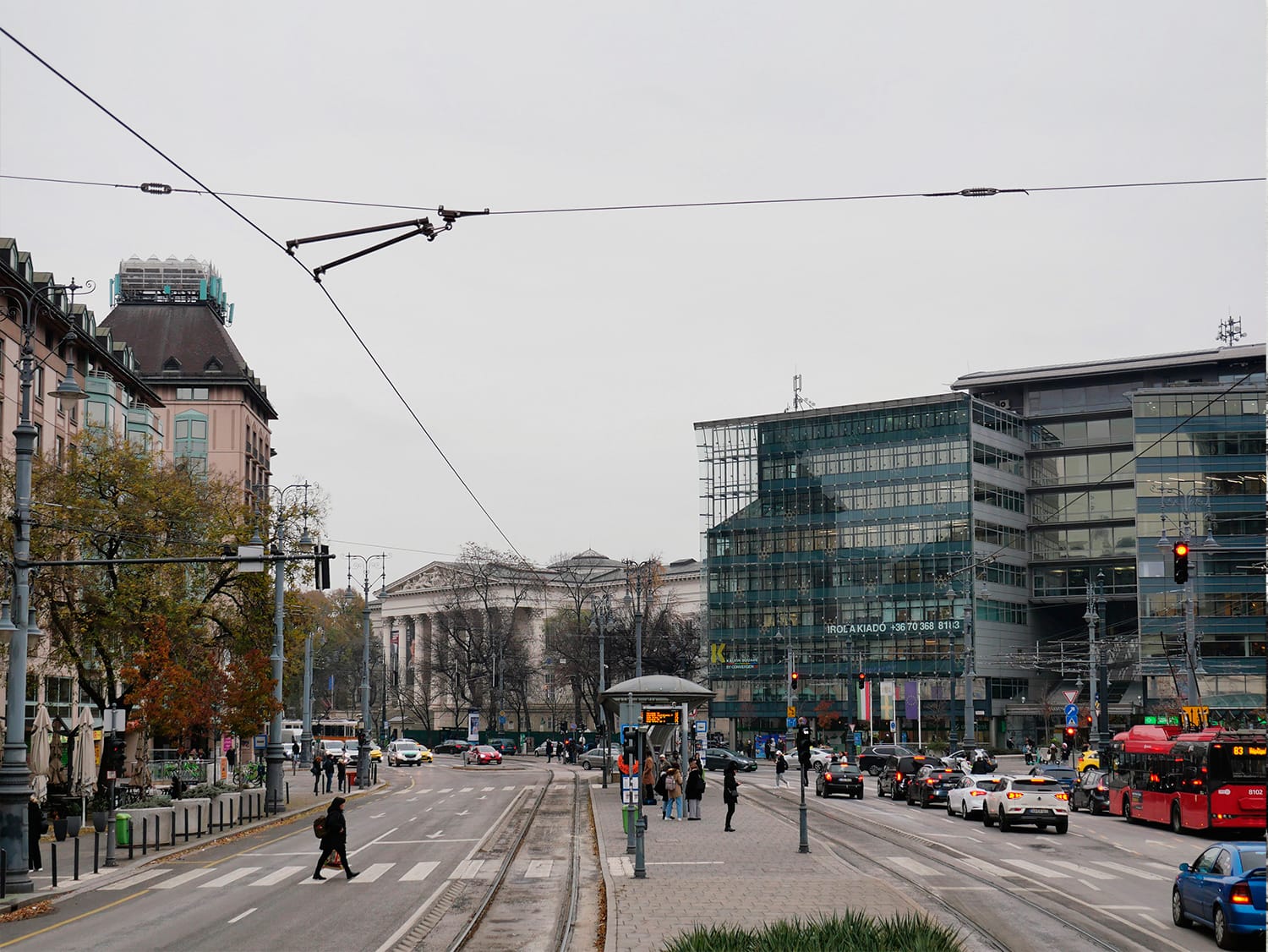 Sheshi Calvin në qendër të Budapestit fotografuar rreth vitit 1900. Shumica e ndërtesave përreth sheshit u shkatërruan gjatë rrethimit të Budapestit në Luftën e Dytë Botërore dhe nuk u restauruan kurrë. Nga të gjitha strukturat që shihen në imazhin e mësipërm të marrë nga arkivi, sot ka mbetur vetëm ndërtesa e Muzeut Kombëtar Hungarez (ndërtesa në qendër). |