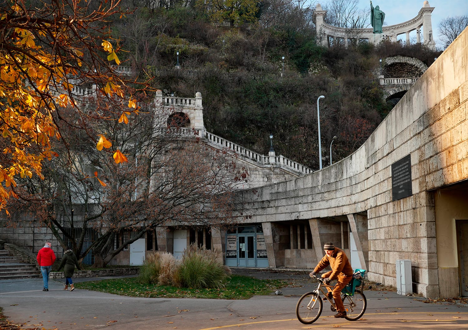 Një pavijon i ndërtuar rreth një burimi natyror në bazën e kodrës Gellert që flluskonte me ujë të ngrohtë dhe pak radioaktiv, fotografuar në vitin 1910. Sot një shatërvan "uji i pijshëm mjekësor" (prapa dyerve gri që shihen në foton e vitit 2023) që del nga i njëjti burim është futur në strukturën e urës së rindërtuar Elizabeth. | Foto nga arkivi: Fortepan/Muzeu Gjeografik Hungarez