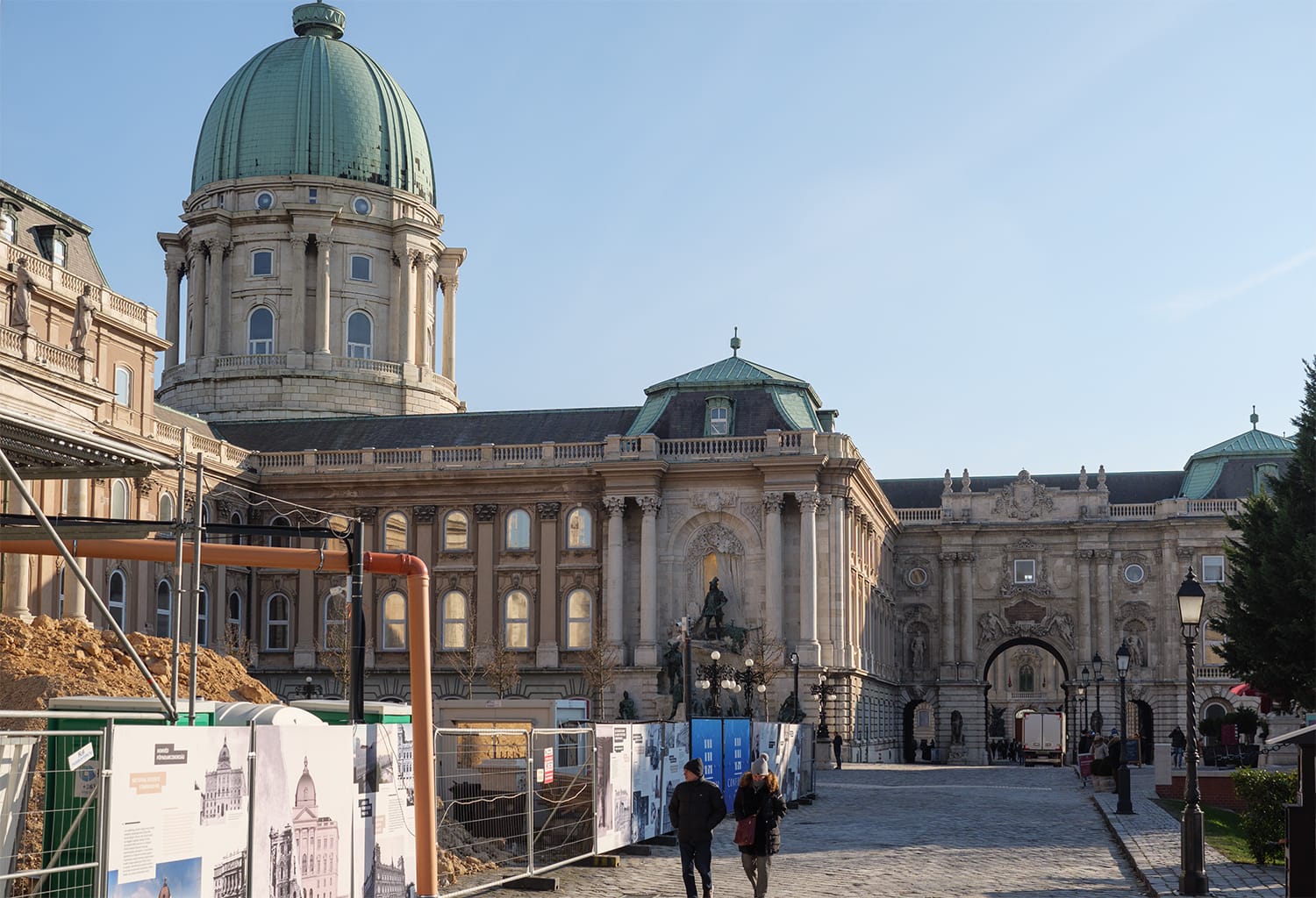 Hapësira perëndimore e Pallatit Buda e fotografuar në vitin 1930. Pallati ishte një nga bastionet e fundit të rezistencës naziste ndaj avancimit të Ushtrisë Sovjetike në Budapest në dimrin e fundit të Luftës së Dytë Botërore dhe u dëmtua rëndë, kryesisht nga zjarri i artilerisë. Rindërtimi i pallatit nën qeverinë komuniste të Hungarisë ia ndryshoi rrënjësisht pamjen ndërtesës. Zbukurimet e stilit të barokut "të panevojshme", u hoqën dhe kupola kryesore u zhvendos disa metra nga pozicioni i saj origjinal. Sot, janë duke u zhvilluar punime masive rinovimi për t’ia rikthyer pallatit lavdinë e tij të mëparshme. | Foto nga arkivi: Fortepan/Olbert Mariann