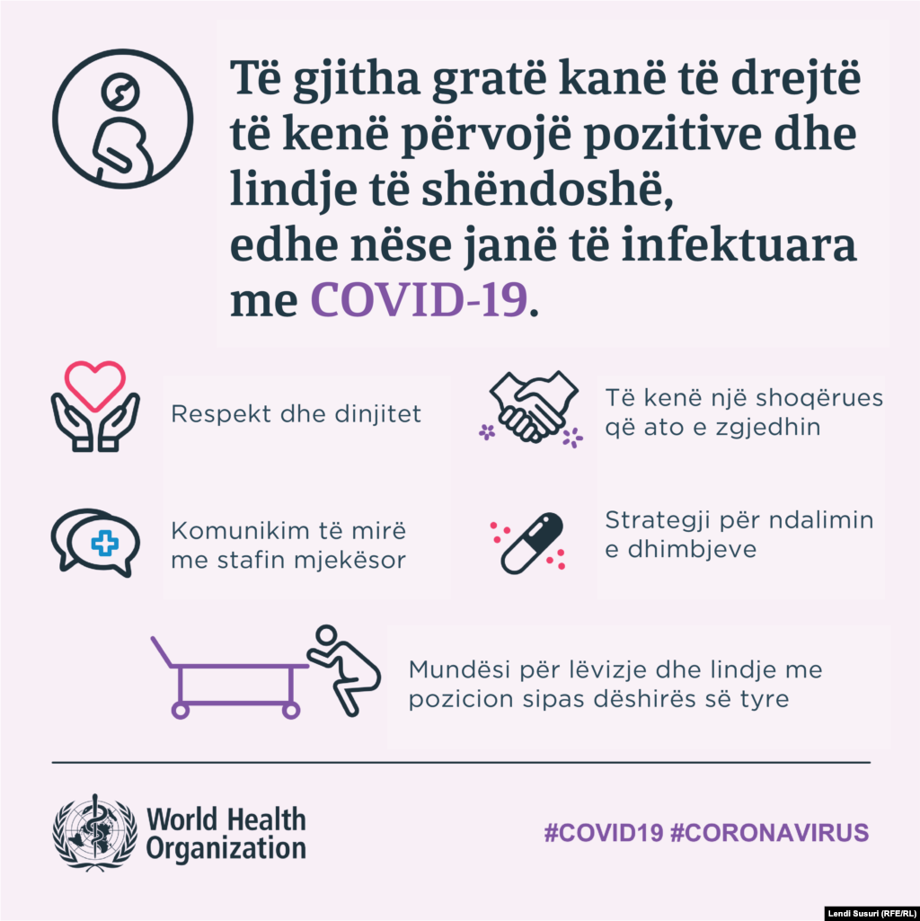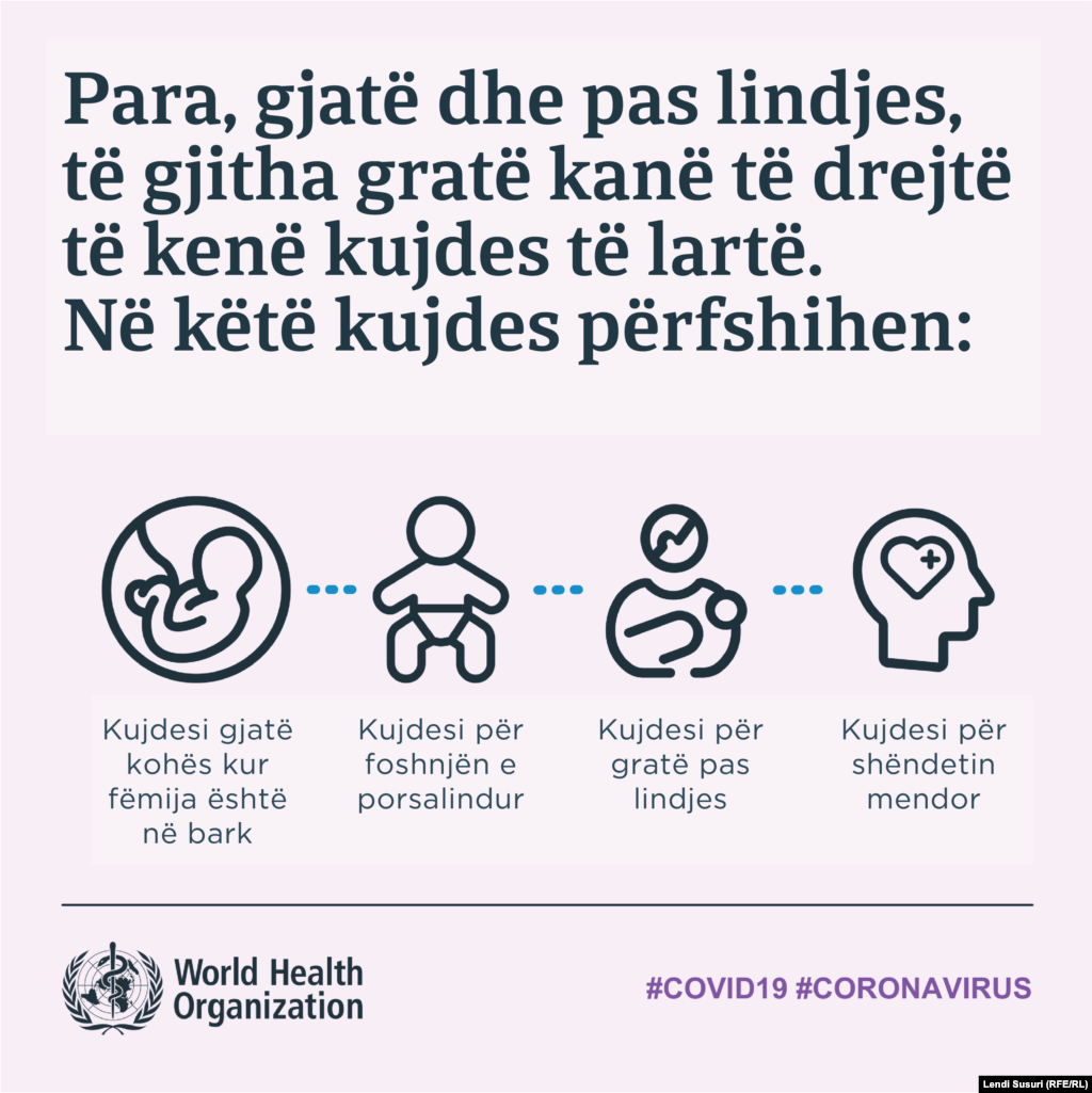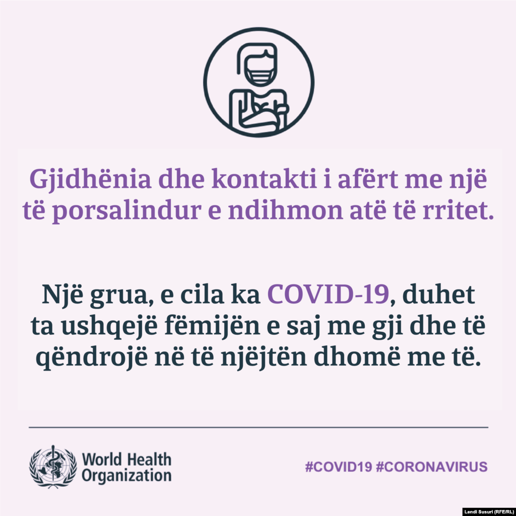 Organizata Botërore e Shëndetësisë ka dhënë disa këshilla për gratë që janë shtatzëna në kohën e pandemisë së koronavirusit. Kjo organizatë po ashtu tregon se si duhet të veprojnë gratë e prekura nga sëmundja COVID-19, të cilat ushqejnë me gji fëmijët e tyre.