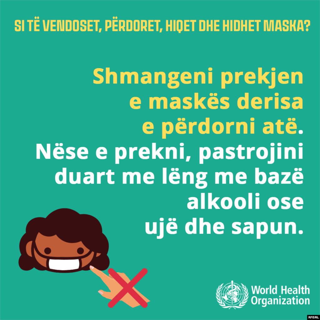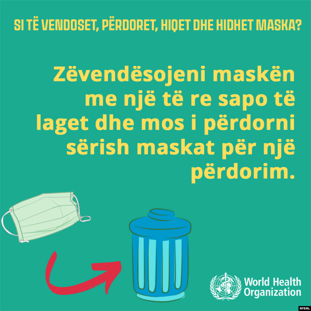 Si duhet të vendoset maska për t’u mbrojtur nga koronavirusi? Sa shpesh duhet të ndërrohet dhe si duhet të hidhet në plehra? Organizata Botërore e Shëndetësisë u përgjigjet këtyre pyetjeve dhe të tjerave përmes infografikave.